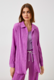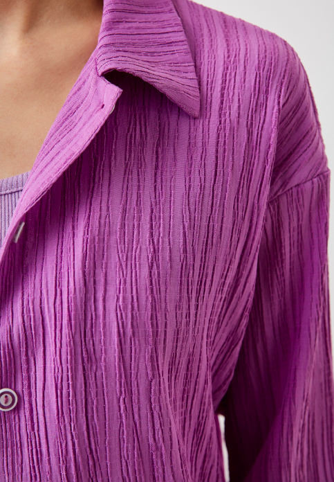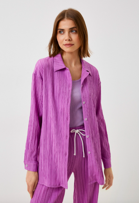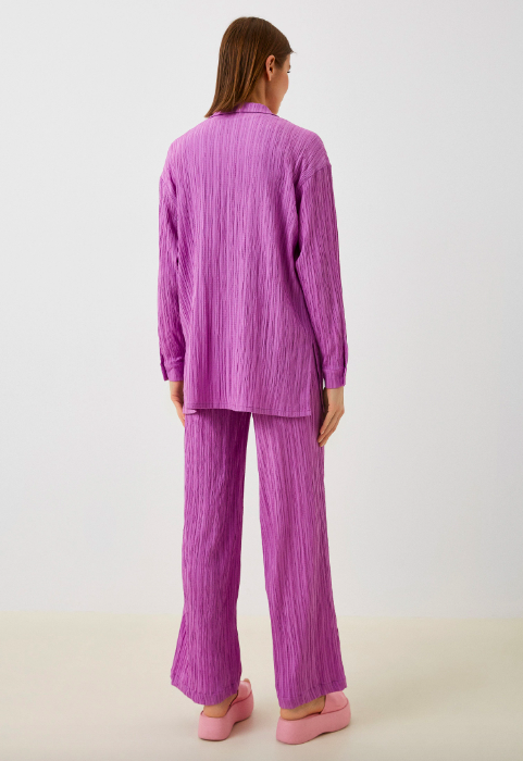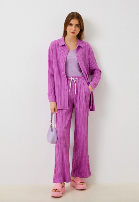 Изысканный, летний костюм с брюками и рубашкой из легкого, жатого, дышащего материала. Рубашка свободного кроя с длинным рукавом, застегивается на пуговицы. Прямые брюки на резинке средней посадки украшены белой шнуровкой. Костюм станет альтернативой платью или сарафану и Вы будите чувствовать себя в нем более расковано и удобно. Модный, летний костюм изготовлен из легкого, струящегося, дышащего материала, что обеспечивает хороший воздухообмен и безусловно является преимуществом. А яркий, нежный, насыщенный сиреневый цвет является трендовым в новом сезоне 2023 года.